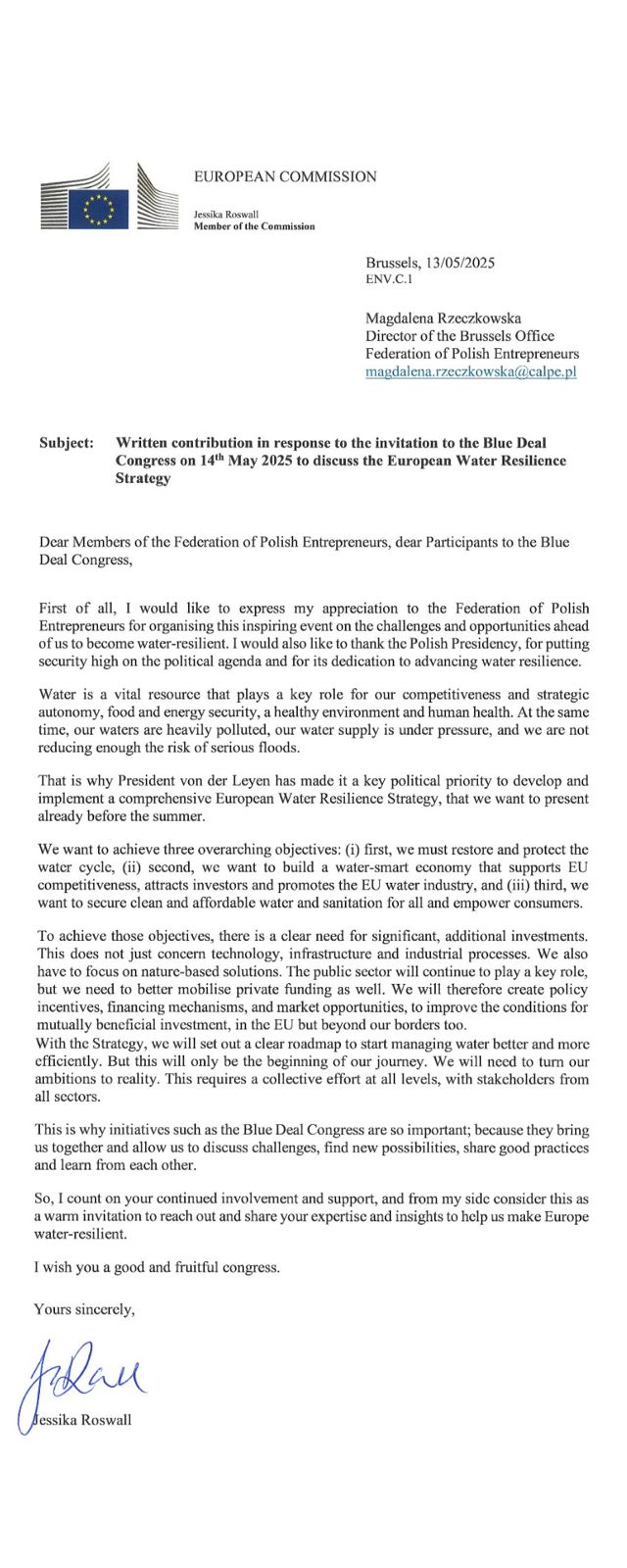 Tuż przed naszym Blue Deal Congress otrzymaliśmy ważny głos poparcia od Komisarz Jessiki Roswall. W swoim liście, odczytanym podczas wydarzenia przez Magdalenę Rzeczkowską, Dyrektor naszego Biura w Brukseli, Komisarz podkreśla kluczową rolę wody dla bezpieczeństwa i rozwoju Europy. To dla nas nie tylko wyraz uznania, ale także mobilizacja do dalszej pracy — wspólnie, ponad sektorami i granicami.